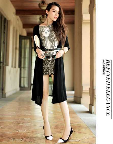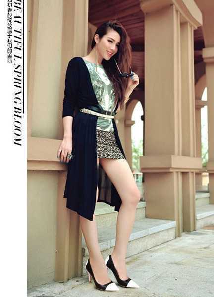 春季黑色尖头高跟鞋,拼色的设计更凸显出时尚感,搭配个性印花T恤,搭配黑色包臀裙,很有范儿,加上黑色长款开衫,尽展出干练优雅气质,让你轻松穿梭在职场上。