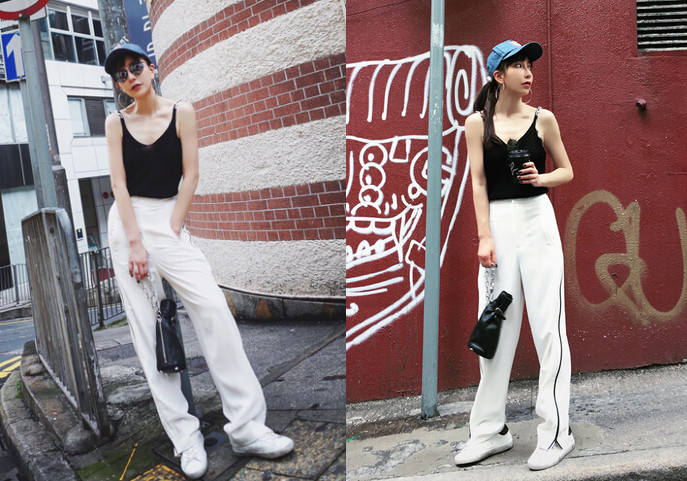 【欧美风搭配04】深v黑色吊带背心舒适又凉爽,搭配着直筒版型的阔腿长裤尽显高挑显瘦的好身材,一顶简单的鸭舌帽和酷炫十足的墨镜都为整个造型起到加分的作用,同样是白鞋的搭配而这款造型给人更多的是不羁随性的欧美范。