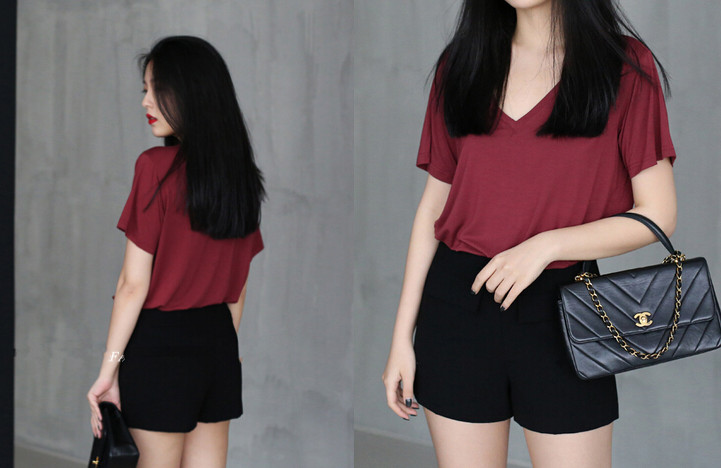【欧美风搭配05】欧美搭配一向善于用最简单的流行元素混搭出不简单的风格。V领宽松的酒红色上衣自然随性,搭配着高腰的黑色短裤尽显大气优雅的时尚范,黑色包包更是与整体造型相得益彰,知性又干练。任何场合都能轻松驾驭。