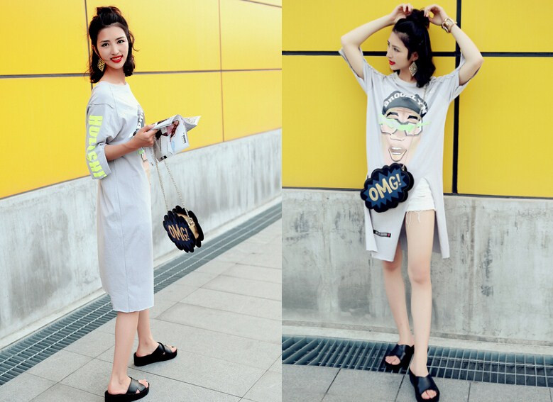 【欧美风搭配02】时尚的圆领印花长T桖简约利落又不乏动感,舒适的露肩袖设计是欧美明星最为青睐的流行元素,能彰显出时尚有型的魅力,搭配着今年大火的小白鞋瞬间就能抓住被人的眼球,再配上一副墨镜尽显大牌欧美范。