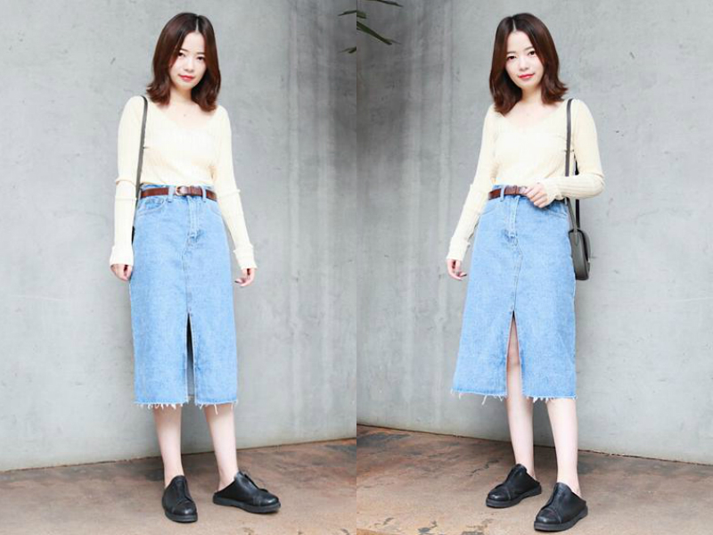 紧身的V领打底衫很显瘦,搭配一条浅蓝色牛仔半身裙看起简约不失时尚感,长至小腿肚的牛仔裙前面的开衩设计使裙子看起来更加特别,露出的皮带增添帅气感。