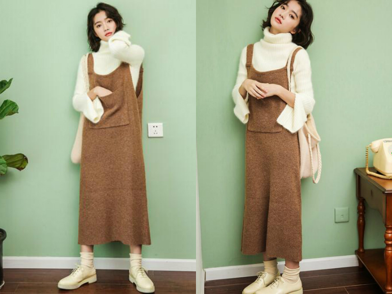 米黄色的高领长袖毛衣一看就觉得很暖和,袖口的裂开设计稍显随性,搭配棕色背带毛呢长裙很减龄,裙子上大大的口袋无形中增添可爱感,与毛衣同色系的皮鞋加上一双高筒袜,更显俏皮。