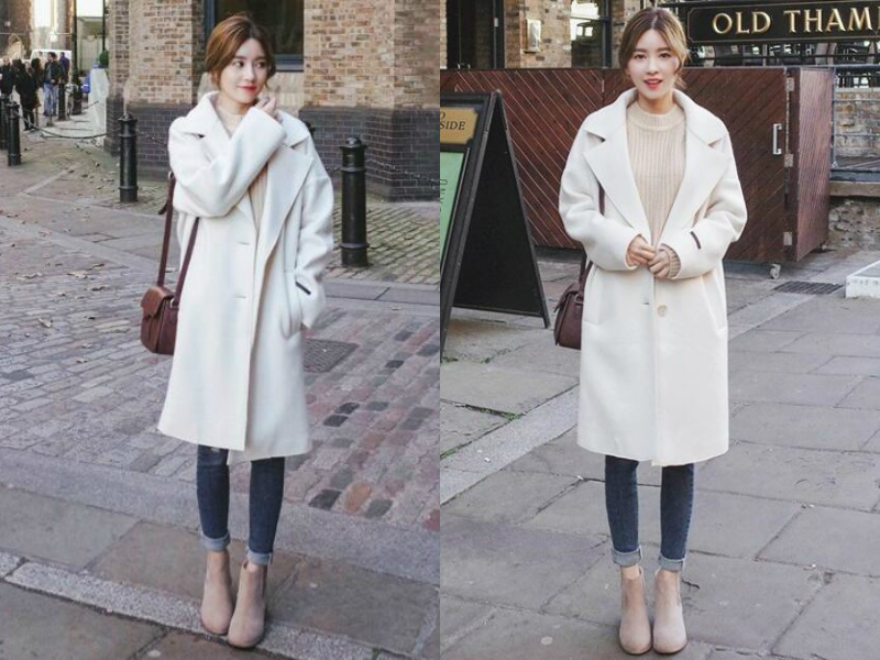冬天当然少不了呢子大衣的存在,保暖的同时不管怎么搭都好看。妹子把一件米色针织毛衣作为打底衫来穿,然后外面穿一件长款的呢子大衣,二者颜色相近,修身显瘦又使妹子看起来温婉动人,再穿一双小粗跟的靴子,整个人的气质就更明显了。