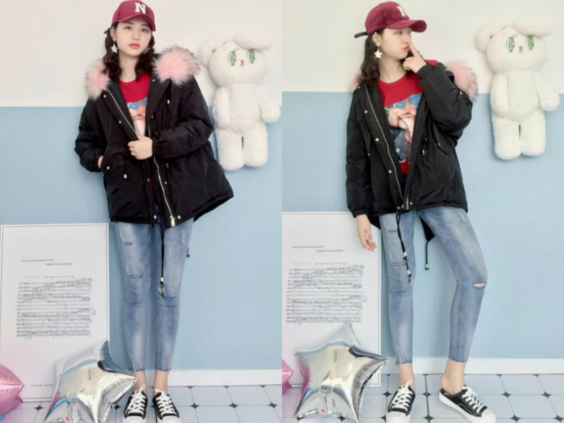 如果去旅游的地方有山,小编就比较推荐这样穿哦!头戴一顶棒球帽就已经充满运动风了,在红色的印花T恤外穿上一件黑色棉服,红黑搭配和谐美观,下面穿一条紧身的浅蓝白色紧身裤,再穿一双帆布鞋,看起来休闲又轻便,走起路来都轻快很多的样子。
