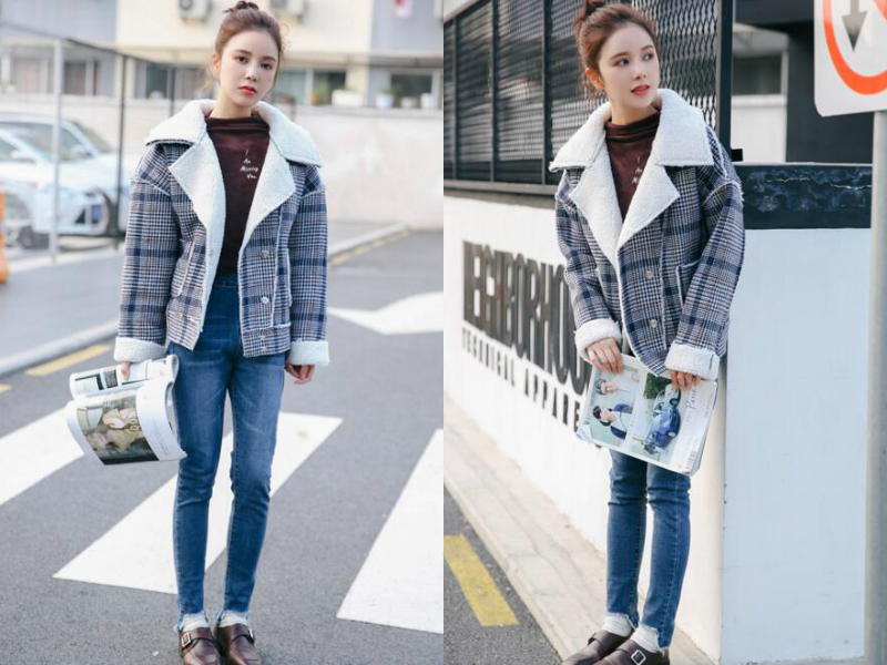 蓝色的格子羊羔外套看起来很保暖,大翻领设计清爽大气,里面随意搭一件深棕色打底衫,衬托得妹子肌肤白皙,下身选择的是一条蓝色紧身牛仔裤,再扎个可爱的丸子头发型,就很有青春学院feel啦!