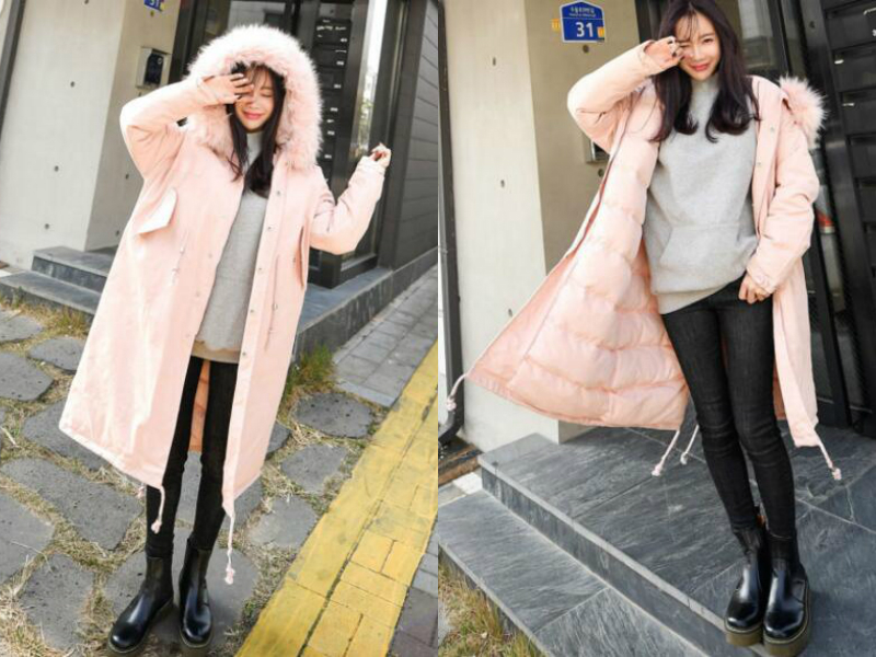粉嫩的颜色看着就很可爱减龄,以一件粉色的长款棉服作为外搭,为妹子增添不少甜美感,里面搭一件卫衣和一条紧身裤看起来随性又显瘦,加上棉服的版型很正又长至膝盖,一下便能包裹住全身让妹子显得更娇小,听说娇小的妹子更能激起男同学的保护欲哦!