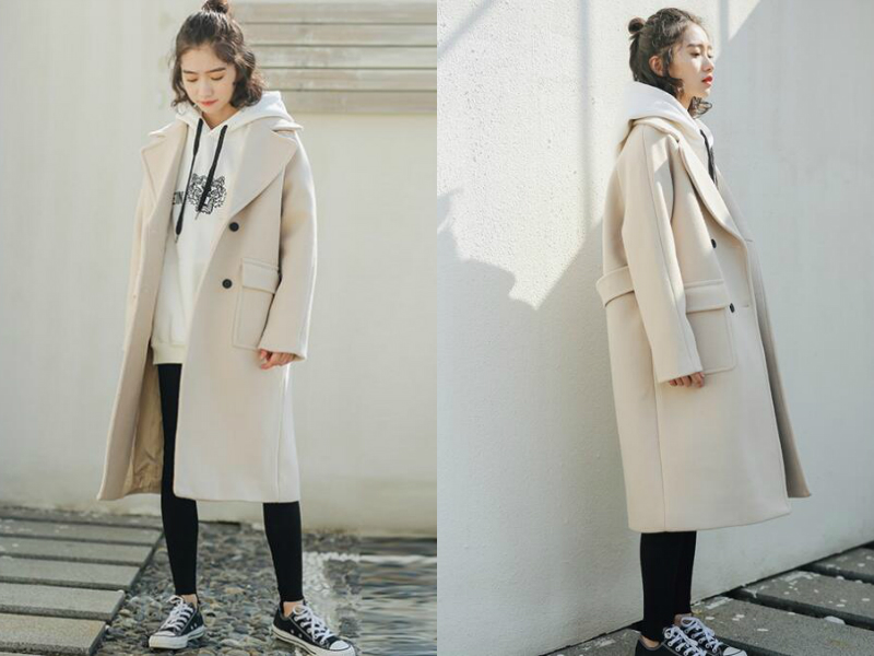 以一件白色连帽包臀卫衣作为内衬,略显休闲范,底下穿一条黑色打底裤,修身又保暖,外面搭一件米色的长款呢子外套,增添一丝严谨的气息,虽是混搭,却很大方得体,让人看了很舒服。