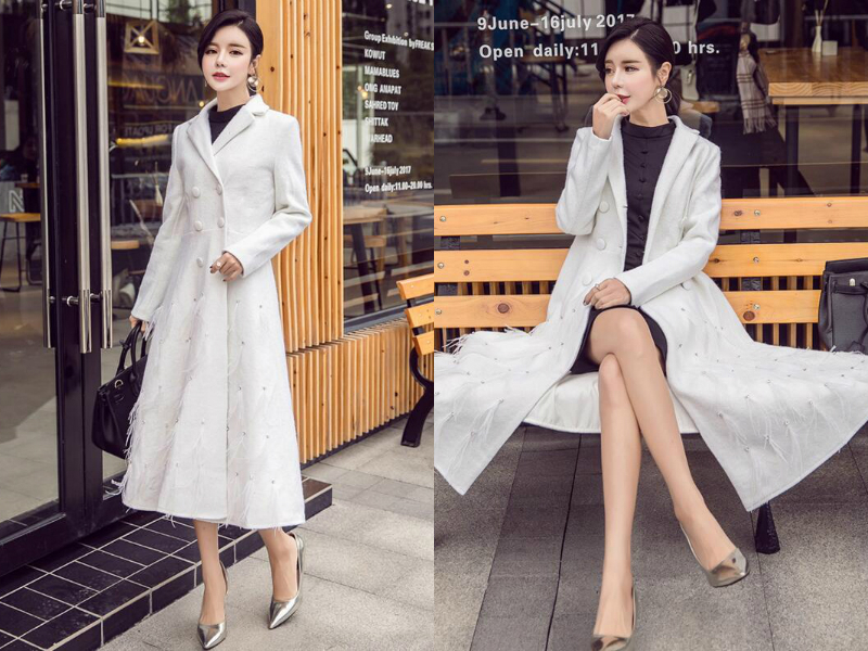 职场女生的穿着多以简洁为主,像妹子这样穿就是如此。外穿一件白色的裙型长款风衣,上身窄下身宽,修饰身形又显大方利落,内搭一件黑色连衣裙,黑白配经典耐看,脚上再穿一双尖头高跟鞋,端庄中流露一丝性感气息。