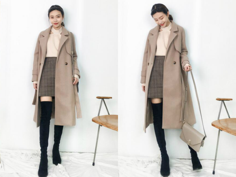 妹子看起来气场很强大的样子,以一件挂脖打底衫作为内衬,下面搭配一条灰色的A字半身短裙,高腰设计提高腰线,再穿一双黑色的长筒靴,大长腿瞬间显现。外套一件长款的呢子大衣,直筒版型加上长至小腿的下摆,使妹子整个人看起来增高显瘦,再把头发简单扎成一束,知性优雅的气质立刻呈现出来。
