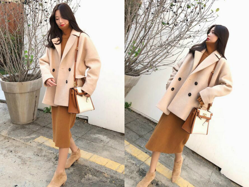 内穿一件驼色的针织连衣裙,修身之余展现出女生温柔淑女的一面,宽松的高领衬托出女生精致的小脸,加上一头卷曲的中长发,在工作中有利于凸显妹子的甜美感。外面在搭配一件米色的短款毛呢外套,保暖又休闲。