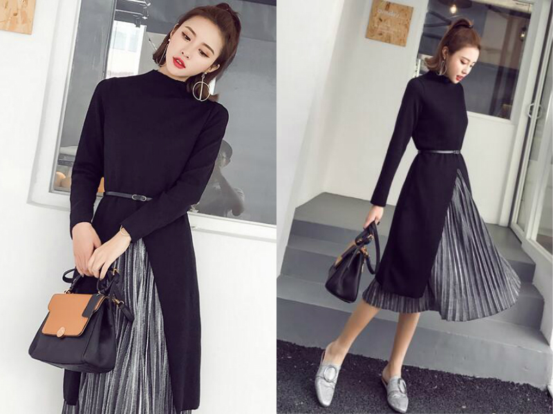 一款时尚修身连衣裙总能让你少了搭配的烦恼,针织毛衣开叉拼接百褶裙令这条裙子非常出众,下摆百褶裙增添了灵动飘逸感,腰间的皮带装饰修身显高挑身材,拎上包包,穿上时尚平底鞋,就可以靓丽地参加同学朋友的聚会了。