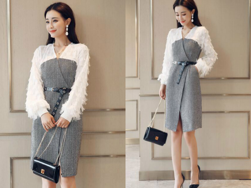 很有设计细节的裙子让人很省心,性感的V领展现迷人锁骨,腰带设计包裹出纤细小蛮腰,视觉上拉长比例,彰显曼妙身姿,开叉的下摆,白色和灰色的拼接,袖子细腻柔软的流苏,如此精致的细节,高贵大方,参加朋友聚会是最合适不过的了。