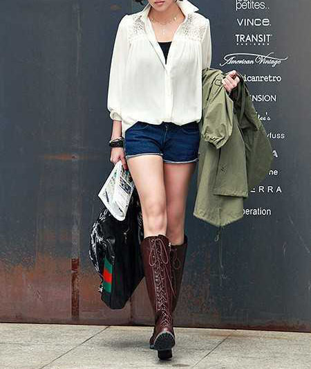 搭配上一双棕色高筒靴,一条牛仔热裤,个性十足,尽显街头御姐风味。