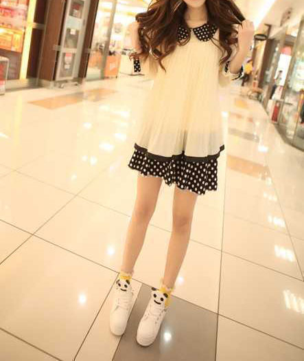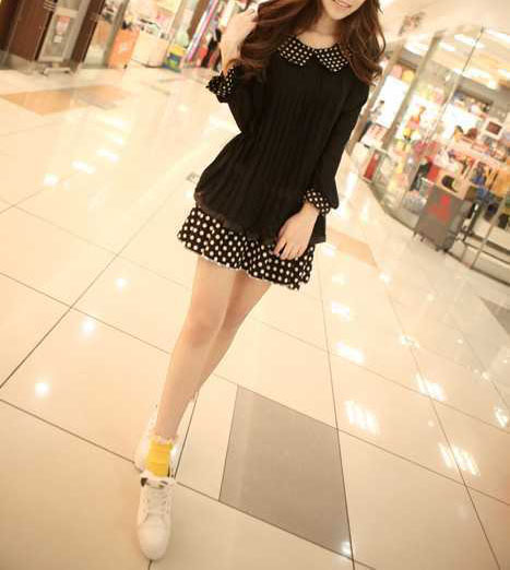 甜美可爱的娃娃领雪纺衫加上俏皮的波点裙真的很搭调,很有小女生的清纯气息,搭配单鞋或者帆布鞋都不错。
