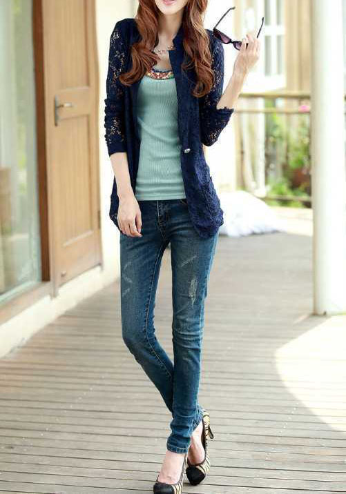 轻熟女气质的专属搭配,蕾丝小外套充满女人味,加上紧身牛仔裤露出腿线,细高跟增加妩媚气质,perfect~~