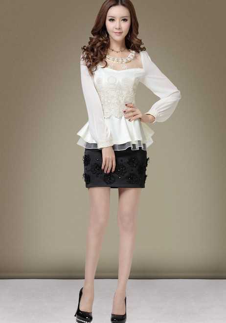 时尚白色韩版荷叶边小衫,搭配超仙美显瘦黑色短裙,尽展曼妙好身材,搭配黑色高跟鞋,完美穿出干练职业OL女性淑女范儿。