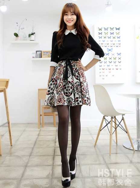 韩范十足的春季娃娃领花裙子,精致的印花是一种时尚的元素,满足女孩们对浪漫梦幻感的向往,搭配显瘦性感的黑色丝袜,完美拉长腿形曲线,将迷人女性魅力发挥到极致。