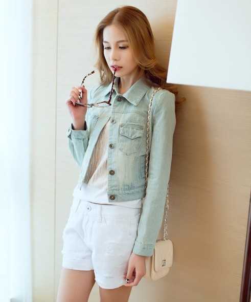 休闲简约的春季牛仔外套, 是春秋冬三季必备的时尚单品,内搭简约的白色打底衫和白色短裤,一身非常清爽时尚的搭配装扮。