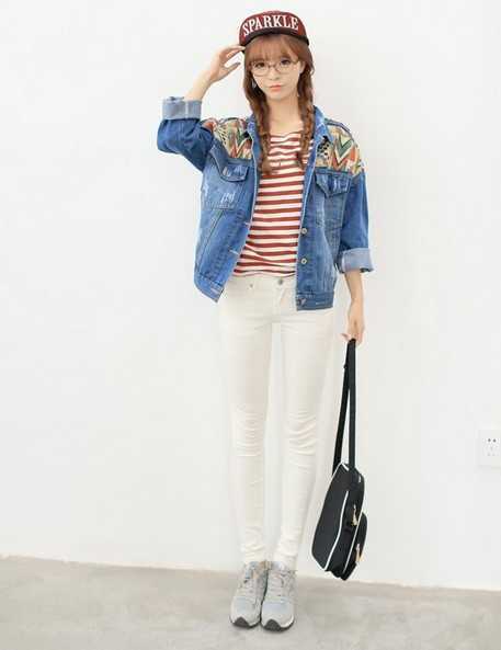 韩范儿风格的春季牛仔外套,内搭简约红色横条打底衫,帅气又清爽,搭配白色紧身裤,穿出小清新时尚范儿。