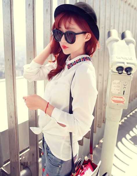 纯白色的衬衫,糖果色彩的娃娃领,更凸显出时尚感,是许多爱美MM们的最爱单品,一身显气质的春季装扮你也能轻松hold住。