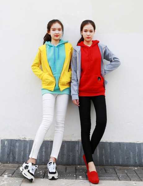 韩版百搭卫衣,搭配亮色春季小外套,尽展青春活力气质,搭配超显瘦黑白配紧身小脚裤,一身超亮眼的装扮让你与闺蜜们走在街上回头率百分百。