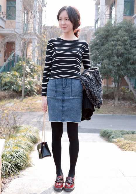 复古风的双条纹针织衫,简单搭配经典牛仔修身短裙,完美凸显玲珑有致好身材,穿出显气质时尚范儿,搭配复古红学院风鞋子,完美打造出复古学院风春装,是一款不错的青春靓丽春季装扮。
