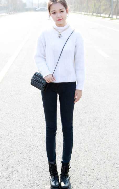 经典百搭黑色小脚裤,很显纤细完美腿形,搭配纯白色高领毛衣,给人一种很清爽干净的感觉,让你穿出韩范十足春装。