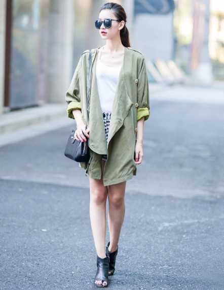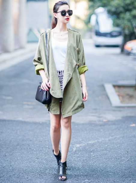 淡绿色早春薄款风衣外套 随性时尚感的早春薄款风衣外套,给人眼前一亮的感觉,搭配简约白色雪纺衫和千鸟格裙子,穿出很青春少女时尚装扮。