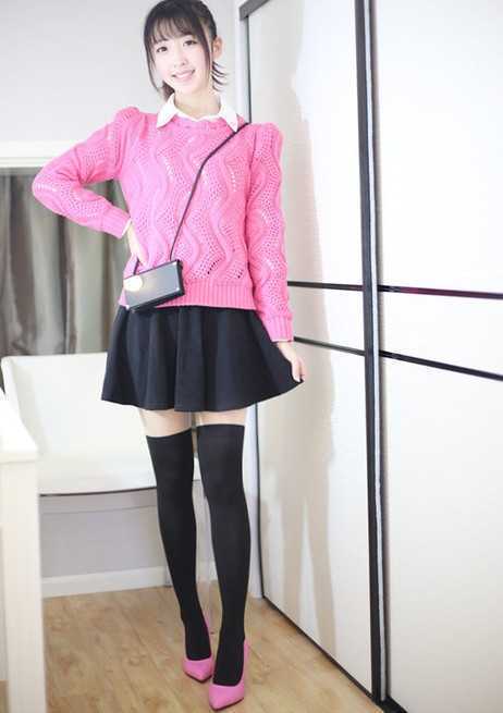 时尚感的春季黑色百褶短裙,搭配枚红色毛衣和衬衫,很养眼时尚,穿出小清新感时尚装扮。