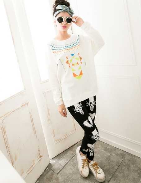 简约大气款的春季几何卫衣,搭配黑色个性图案打底裤,经典黑白搭配法,无论怎么搭配都很好时尚。