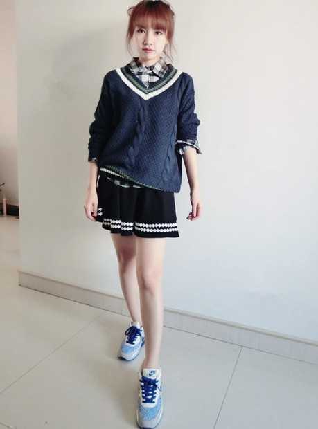 春季藏蓝色毛衣,搭配时尚黑白格子衬衫,搭配黑色百褶短裙,是时尚春季学院风最佳的搭配法,妹子们赶紧学一下 吧。