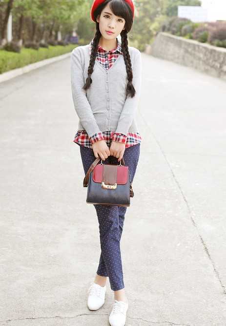 低调大气的春季开衫,搭配英伦味的格子衬衫,搭配小可爱的波点休闲裤,很时尚甜美的学院风装扮,适合偏爱甜美女性们穿着。