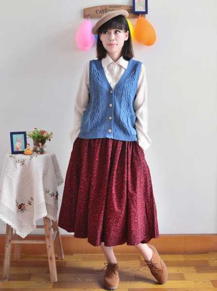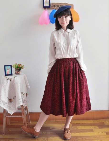 洋气红色春季碎花半身长裙,搭配简约米白色衬衫,很清纯好看,搭配复古风格的棕色鞋子,增添复古风格调,穿出复古文艺范儿。