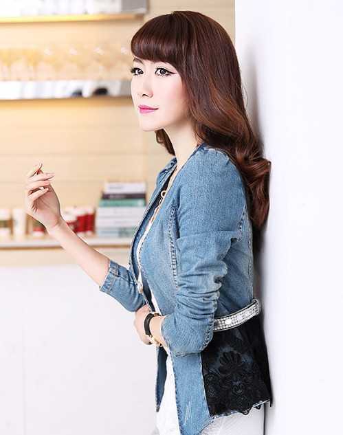 侧面看牛仔外套,很休闲时尚,精美小性感的黑色蕾丝拼接,更凸显出迷人女人味。