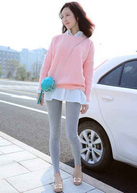 春季粉色套头毛衣,搭配清爽白色衬衫,很舒适好看呢,是粉色控妹子最爱的一款吧,搭配低调灰色打底裤,很显苗条好身材,穿出青春甜美范儿,是学生妹们必备的一款时尚装扮哦。