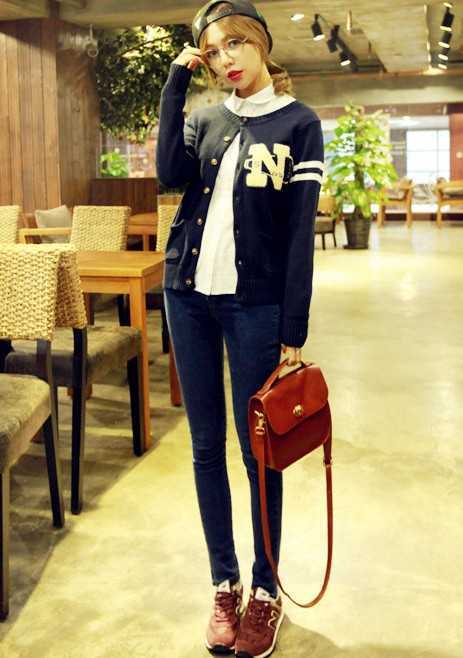 休闲风春季黑色棒球外套,是春季必备的百搭单品,搭配简单白色衬衫,很清新休闲感,加上经典的紧身裤和运动鞋,尽展青春活力感,最适合学生一族的MM们不过了。