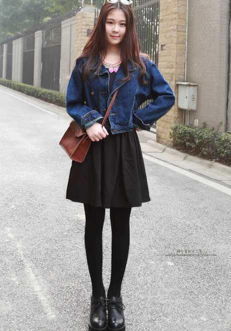 春季个性牛仔外套,搭配性感百搭黑色连衣裙,帅气中透露出迷人女人味,加上百搭黑色打底裤和鞋子,时尚又大气,还不挑人穿呢,矮个子MM也能轻松hold住。