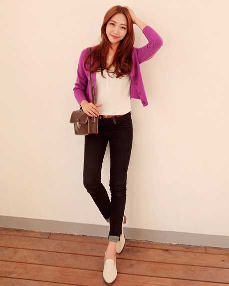 春季衣橱必备的短款针织开衫,搭配简约白色背心,性感又甜美,搭配休闲风的牛仔裤和白色鞋子,很舒适自然,很适合学生一族的妹子们穿着了。