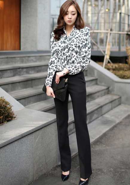 春季黑色碎花雪纺衬衫,百搭又显稳重感的款式,最适合上班一族的MM们穿着了,搭配黑色百搭休闲裤和高跟鞋,穿出优雅时尚范儿。
