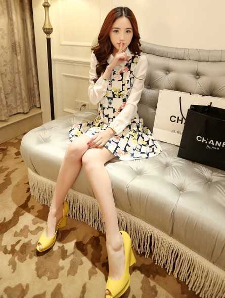 早春韩味十足的连衣裙,时尚个性的几何图案,增添几分时尚感,搭配亮眼的黄色高跟鞋,很显腿部白皙肤色,尽展出优雅淑女范儿。