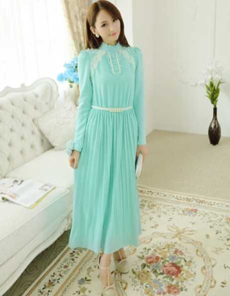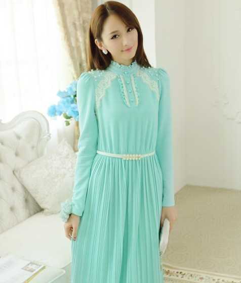 青色春季飘逸雪纺长裙搭配