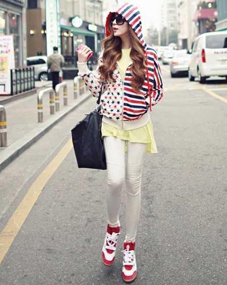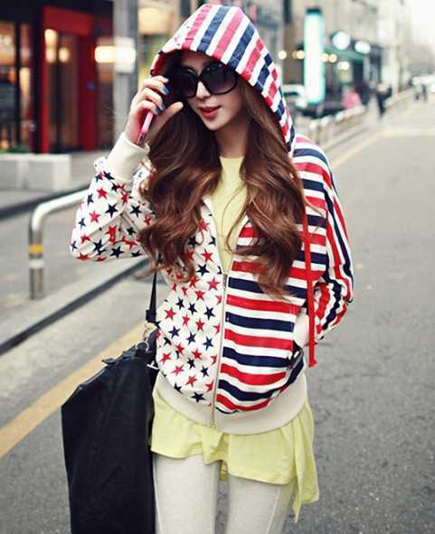时尚感十足的2014年春季格子卫衣外套,独特的条纹与星星点缀着,增添几分甜美感,搭配嫩黄色打底T衫和白色小脚裤,凸显出高挑好身材,轻松演绎出时尚运动风。