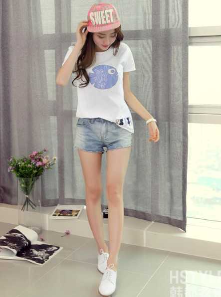 清爽甜美的春季韩版休闲T恤衫,搭配简单洗水牛仔短裤,很随性时尚,加上白色单鞋,尽展甜美休闲风。