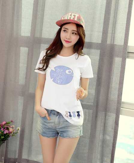 春季韩版休闲T恤衫,可爱小鱼印花设计,让你穿着甜美可人。