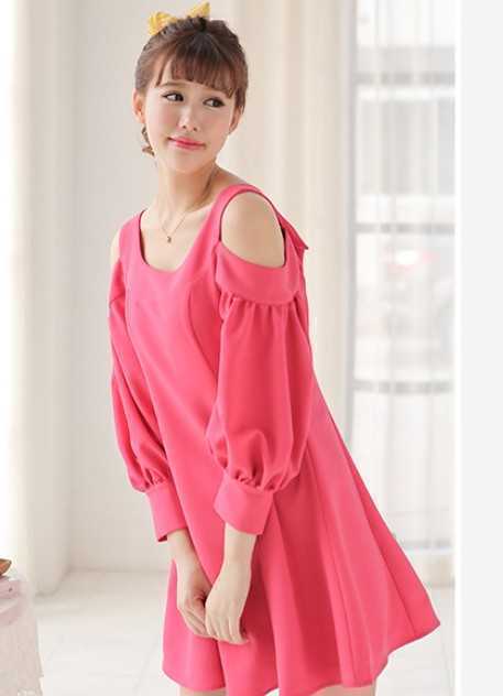 缤纷色彩的春季枚红色露肩连衣裙,时尚露肩的设计,微露出的香肩更显诱惑感,搭配简约的单鞋或高跟鞋,都很优雅好看呢!
