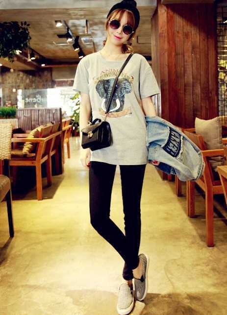 低调大气的早春新款短T恤,卡通版的大象印花,增添几分可爱,搭配百搭黑色小脚裤,很显瘦显瘦,加上舒适春季平底鞋,一身轻盈的时尚装扮,让你玩转时尚潮流范。