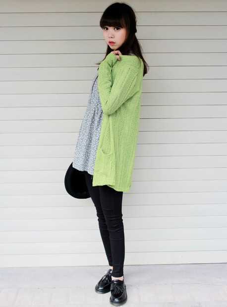 春季绿色针织开衫,给人一种小清新的感觉,搭配森林系碎花连衣裙,增添几分甜美感,搭配黑色小脚裤和黑色鞋子,穿出显甜美时尚范儿。