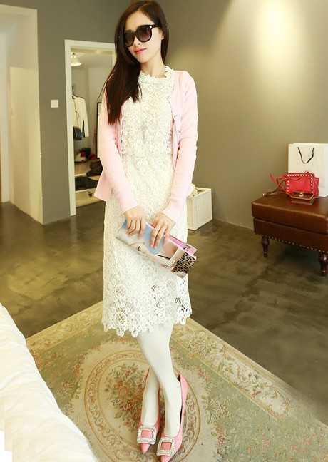 粉嫩春季针织开衫,搭配仙美蕾丝白色连衣裙,衬出性感时尚范儿,搭配粉色水钻平底鞋,尽展出甜美气质。