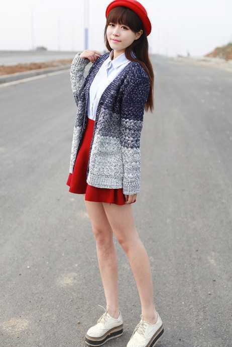 春季复古风渐变色针织开衫,搭配净白色衬衫,很清纯可人,搭配红色百褶短裙,给人一种甜美亲切的感觉,打造出甜美乖乖女范儿。