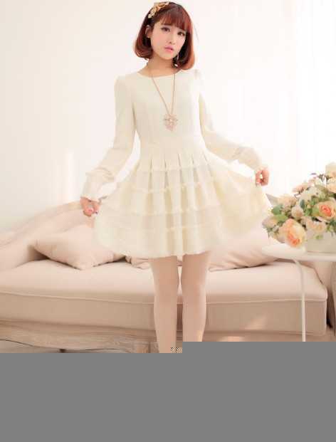 春季白色连衣裙,百褶的裙摆增添甜美感,搭配白色打底袜,搭配日系棕色高跟鞋,穿出甜美日系森女风装扮。